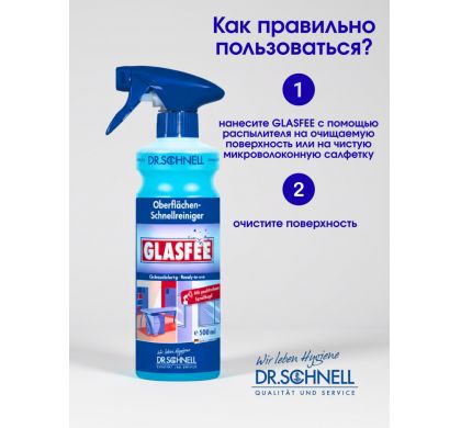 Инструкция по применению: Нанесите GLASFEE непосредственно на очищаемую поверхность или на чистую микроволоконную салфетку и очистите поверхность.