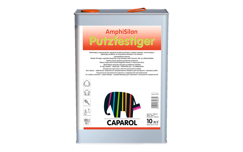 Со средством AmphiSilan-Putzfestiger обеспечивается получение укрепляющих грунтовочных покрытий на критических основаниях, таких как мелящиеся или сильно впитывающие и старые окрашенные поверхности, шлифованные гипсовые поверхности, смытые клеевые краски и гипсокартонные плиты.