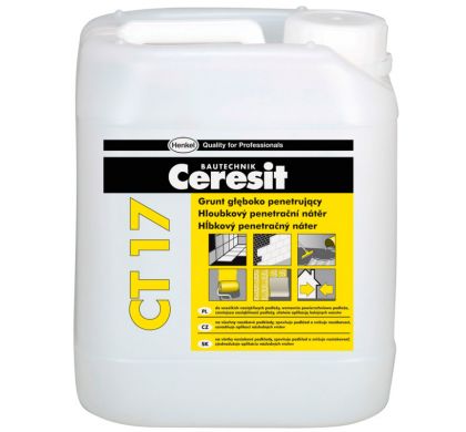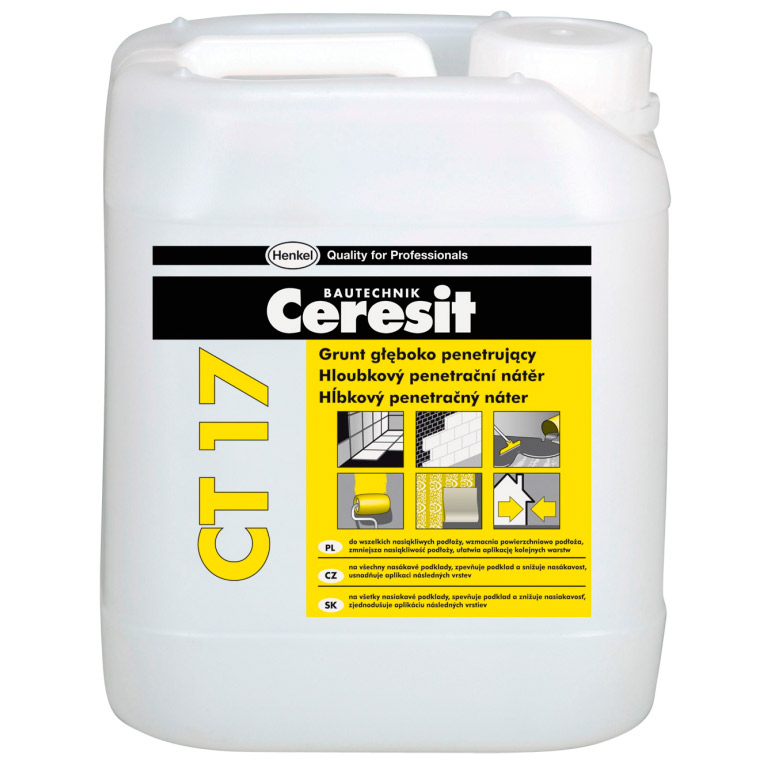 Ceresit CT 17 ProfiGrunt применяется для поверхностного укрепления и пропитки пористых, непрочных и сильновпитывающих минеральных оснований (легкий бетон, штукатурка, гипсовые и кирпичные поверхности) внутри и снаружи зданий перед укладкой керамической плитки, приклеиванием теплоизоляционных плит, шпатлеванием, оштукатуриванием, окраской, устройством самонивелирующихся цементных покрытий на полах. Ceresit CT 17 ProfiGrunt особенно рекомендуется для грунтования ангидритовых, гипсовых, ячеисто-бетонных оснований. Грунтовка проникает в основание и связывает зерна наполнителя, однако при этом не увеличивает прочностные параметры по всему сечению основания. Для грунтования основания под декоративные тонкослойные штукатурки необходимо использовать грунтующую краску Ceresit CT 16, а при грунтовании невпитывающих оснований (керамическая плитка, ДСП, OSB и др.) – адгезионную грунтовку «Бетонконтакт» Ceresit CT 19 или пленкообразующую грунтовку Ceresit CN 94.