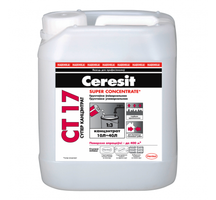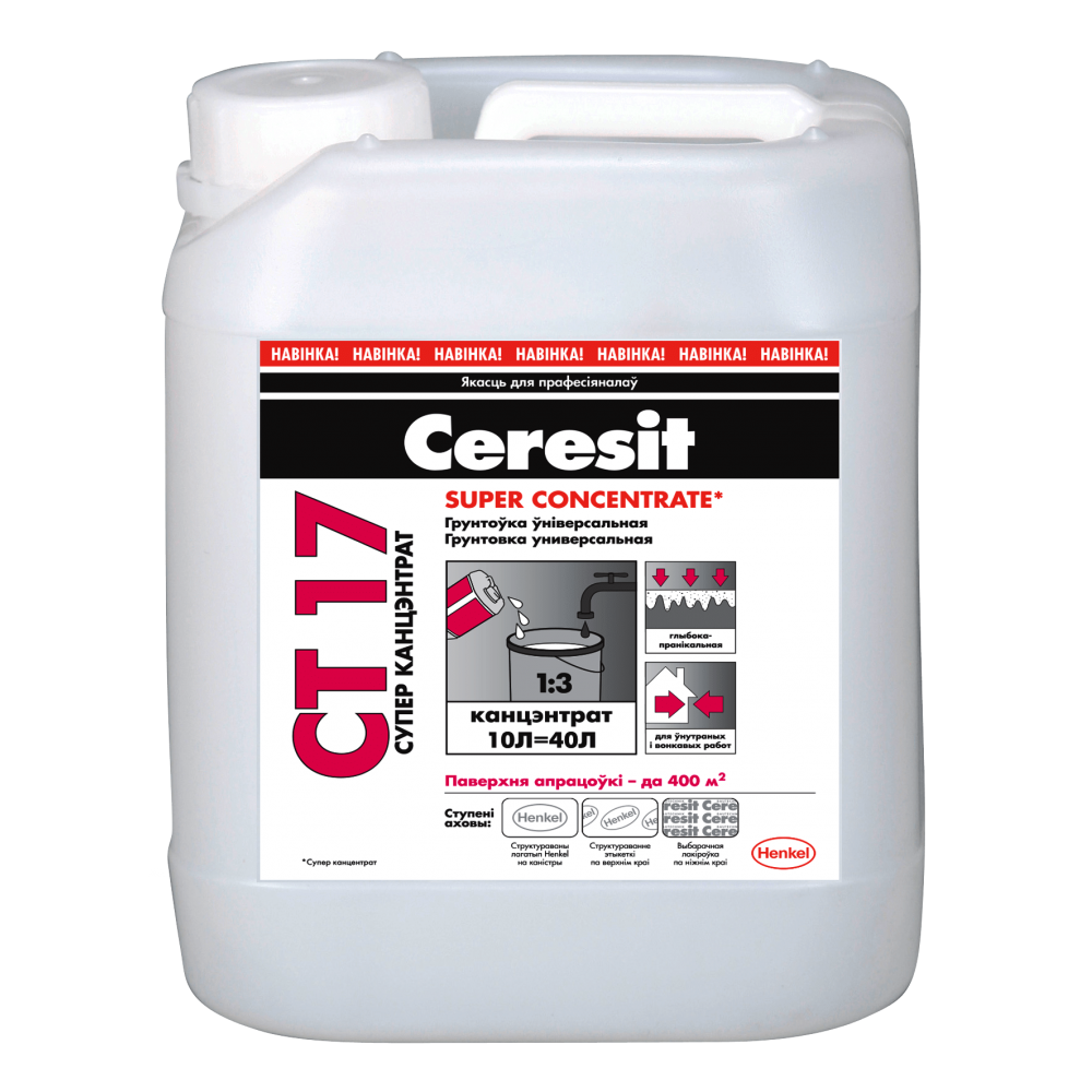 Ceresit CT 17 Super Concentrate применяется для поверхностного укрепления и пропитки минеральных оснований (газосиликатные блоки, бетон, железобетон, штукатурка, гипсовые и кирпичные поверхности и др.) внутри и снаружи зданий перед оклейкой обоями, окраской, шпатлеванием, а также может применяться перед укладкой керамической плитки, напольных выравнивающих смесей. Грунтовка проникает в основание и связывает зерна наполнителя, однако при этом не увеличивает прочностные параметры по всему сечению основания. Ceresit CT 17 Super Concentrate особенно рекомендуется для использования на гипсовых, ангидритовых и газосиликатных основаниях. Для грунтования основания под декоративные тонкослойные штукатурки необходимо использовать грунтующую краску Ceresit CT 16, а при грунтовании невпитывающих оснований (керамическая плитка, ДСП, OSB и др.) – адгезионную грунтовку «Бетонконтакт» Ceresit CT 19 или пленкообразующую грунтовку Ceresit CN 94.