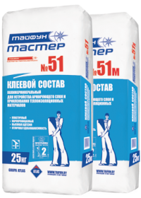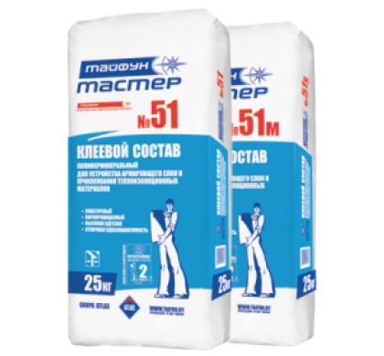 Клеевой состав «Тайфун Мастер» №51 предназначен для устройства армированного слоя в системе тепловой изоляции наружных ограждающих конструкций зданий и сооружений «Тайфун».При необходимости применяется для наклеивания теплоизоляционных плит.