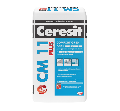Клей Ceresit СМ 11 предназначен для крепления керамогранита, керамических плиток и плиток из натурального и искусственного камня с водопоглощением не менее 1% и размером до 30х30 см на недеформирующихся минеральных основаниях. Ceresit СМ 11 применяется для устройства плиточных облицовок на стенах и полах, при внутренних и наружных работах (включая помещения с постоянной влажностью), в гражданском и промышленном строительстве.