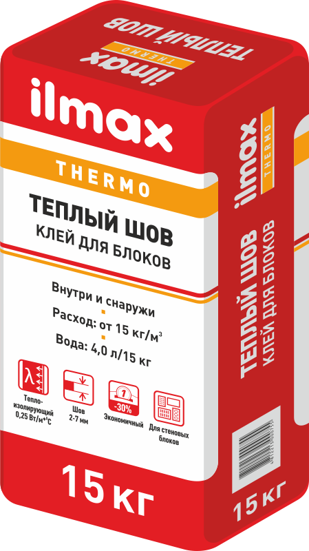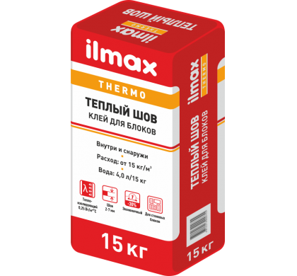 ilmax thermo Теплый шов предназначен для укладки керамзитобетонных и пенобетонных блоков, поризованных (пустотелых) керамических блоков, блоков из ячеистого бетона, в том числе газосиликатных, и других штучных стеновых материалов с точностью изготовления по высоте не более ± 2 мм, устранения дефектов (неровности, выбоины, сколы) в них.