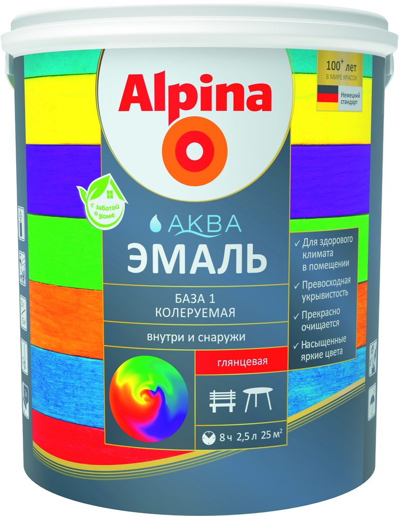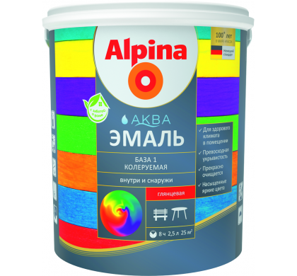 Продукт колеруется в широкий диапазон оттенков. Создает яркую цветную глянцевую/полуматовую, устойчивую к царапинам поверхность. Практически без запаха во время нанесения и высыхания. На водной основе. Легко наносится, быстро высыхает и прекрасно очищается. Alpina АКВА эмаль колеруемая не содержит вредных примесей выше норм, установленных в ЕС и странах СНГ.