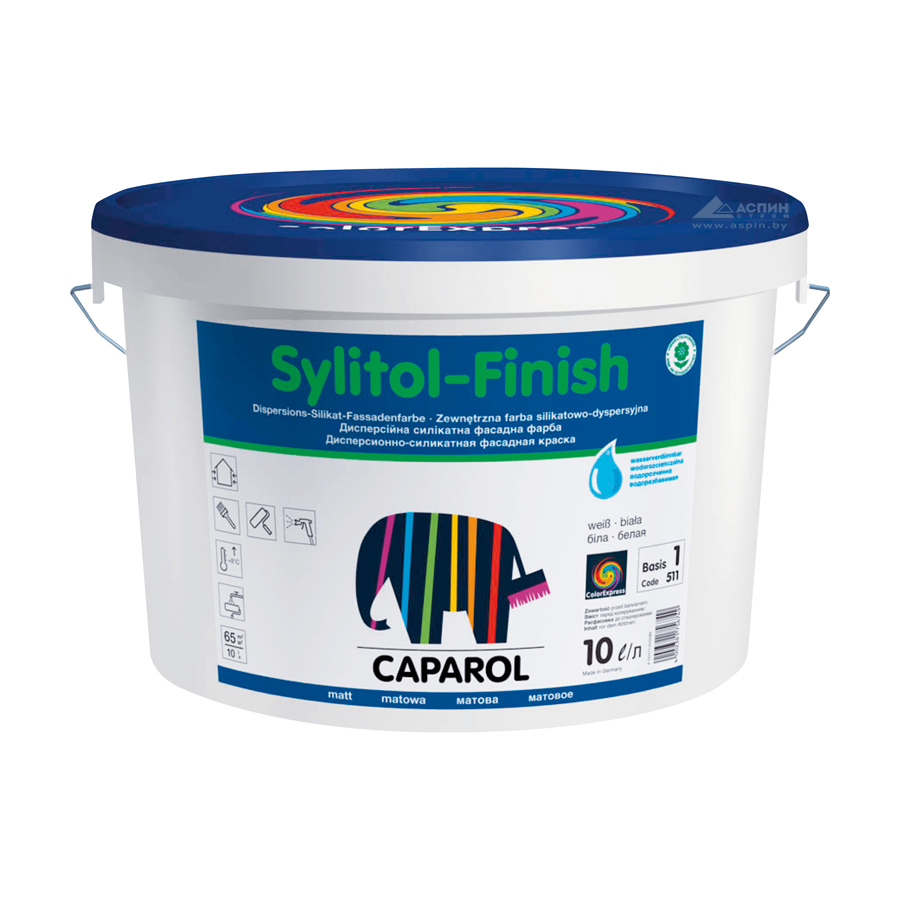 Caparol Sylitol finish (Силитол Финиш) – Силикатная фасадная краска высокого качества для окраски силикатных и минеральных штукатурок. Основа – жидкое калиевое стекло с добавлением органических стабилизаторов.Sylitol finish применяется в качестве цветового покрытия систем утепления, оштукатуренных поверхностей, фасадного профиля Capapor. Рекомендуется для систем санирующих штукатурок. Производство - Германия.