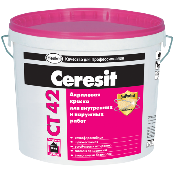 Акриловая краска CT 42 предназначена для окрашивания минеральных и акриловых декоративных штукатурных покрытий, таких как CT 35, CT 137, CT 60, CT 63 и CT 64, а также бетона, цементно-песчаных, цементно-известковых и известковых штукатурок, как внутри, так и снаружи зданий. Рекомендована для систем теплоизоляции фасадов с пенополистирольными плитами (Ceresit EPS). Не пригодна для полов!