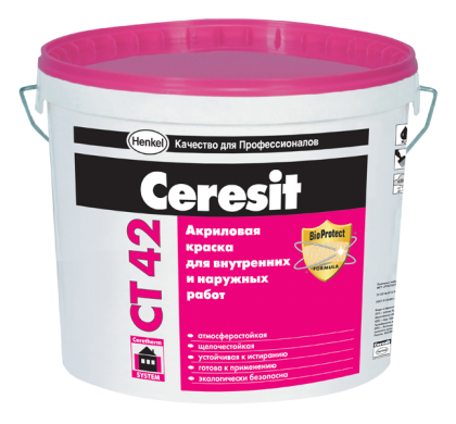 Акриловая краска CT 42 предназначена для окрашивания минеральных и акриловых декоративных штукатурных покрытий, таких как CT 35, CT 137, CT 60, CT 63 и CT 64, а также бетона, цементно-песчаных, цементно-известковых и известковых штукатурок, как внутри, так и снаружи зданий. Рекомендована для систем теплоизоляции фасадов с пенополистирольными плитами (Ceresit EPS). Не пригодна для полов!