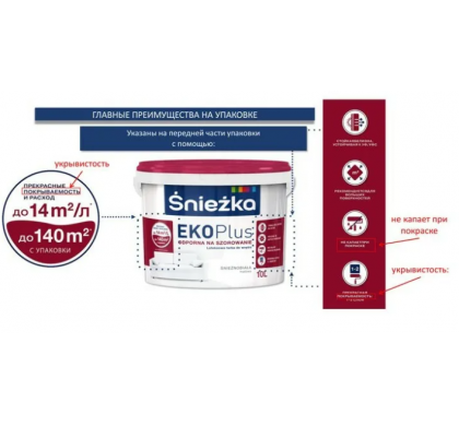 Краска ŚNIEŻKA EKO Plus характеризуется снежно-белым цветом с высоким уровнем матовости. Создаёт стойкое белое покрытие, устойчивое к истиранию и воздействию ультрафиолетовых и UVC лучей.