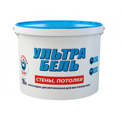 Водно-дисперсионная краска для внутренних работ «Ультра Бель» предназначена для декоративной покраски стен и потолков из цементных, цементно-известковых, известковых, гипсовых растворов, гипсокартонных плит, деревянных материалов внутри помещений.