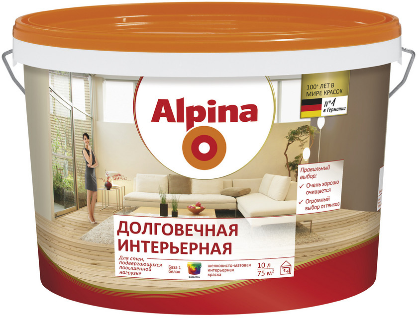 База 1 может применяться как белая краска или заколерованная в один из многочисленных светлых оттенков вручную с помощью колорантов Alpina Kolorant или Alpina Tint, а также машинным способом с помощью Alpina ColorMix. Для насыщенных оттенков используйте, пожалуйста, только базу 3, отколерованную с помощью Alpina ColorMix.