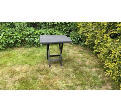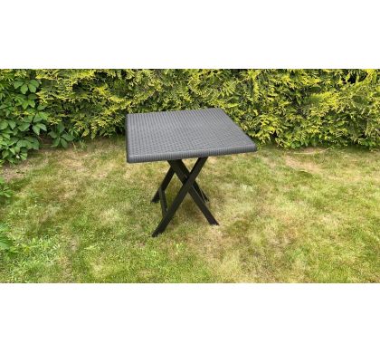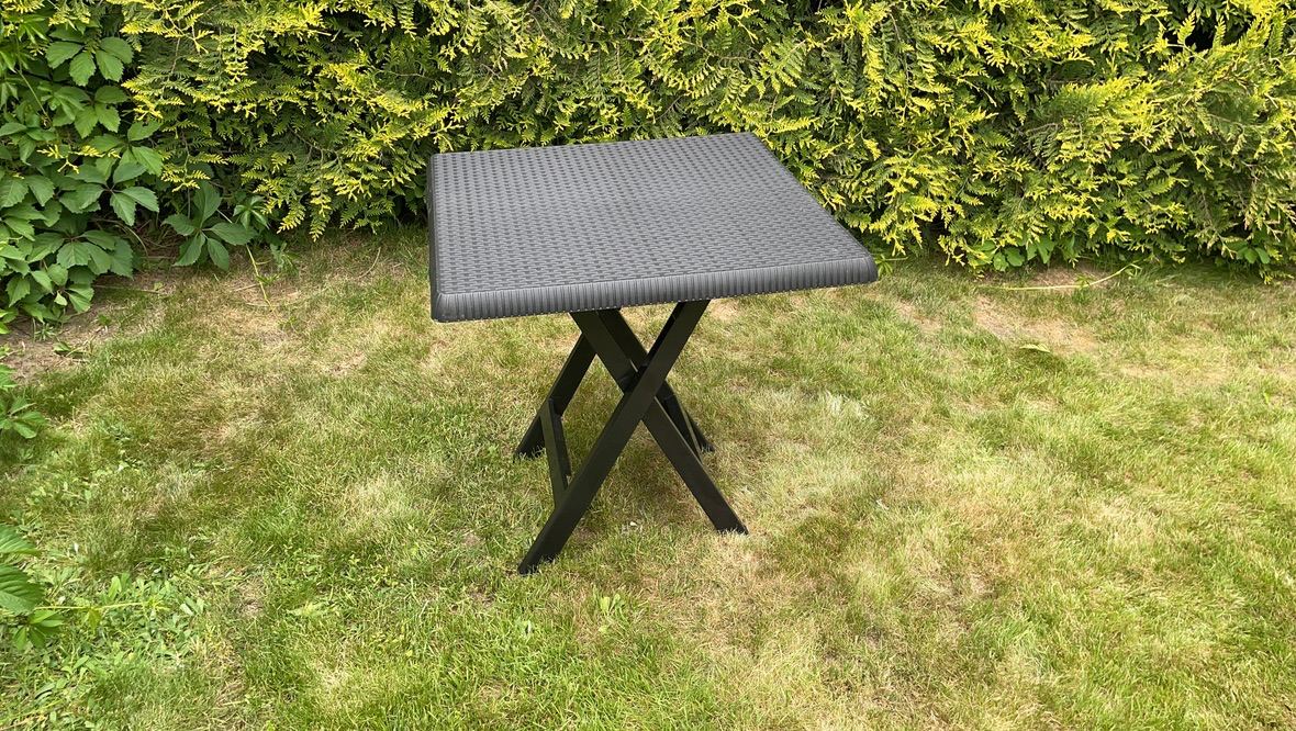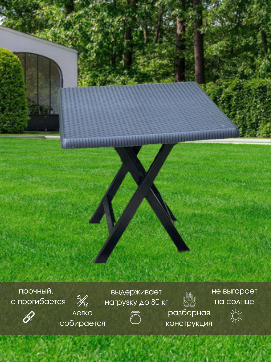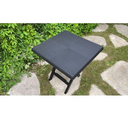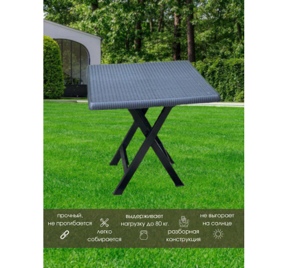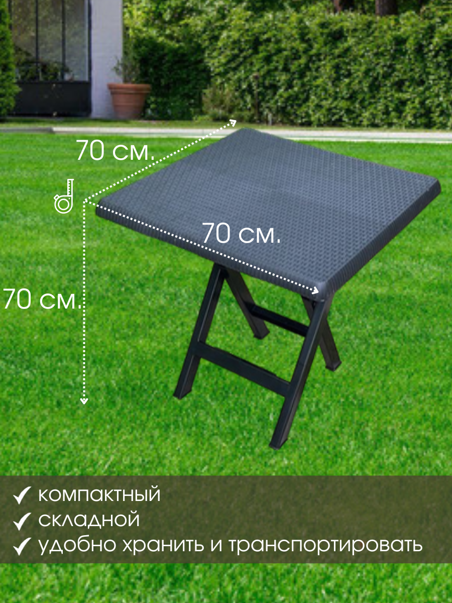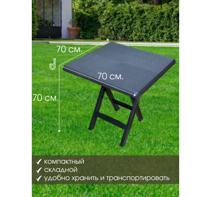 Стол складной, для отдыха на природе, для рыбалки, садовый стол, предназначен для использования на даче и дома, на террасах, газонах и балконах. Размер стола 70х70 см позволяет использовать его как полноценный обеденный стол для небольшой семьи. Столешница из водостойкого пластика с модным плетением под ротанг. Цвет антрацит придает элегантность оформлению террас и внутренних интерьеров. Прекрасно выполнена внутренняя поверхность стола. Пластиковая защита ножек исключает царапины при использовании внутри помещения. Водостойкий пластик столешницы позволяет оставлять стол на открытом воздухе в течение всего сезона. Стол плоско складывается и не занимает много места при хранении. Защитные пластиковые наконечники на ножках. Компактный размер стола позволяет использовать его не только на террасах и газонах, но также на балконах и внутри небольших помещений. Размер в разложенном виде: 70x70x70 см. Вес: 3,2 кг. Нагрузка: 80 кг. Производство: Сербия.
