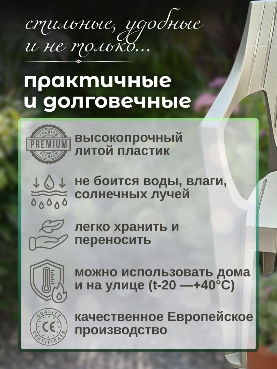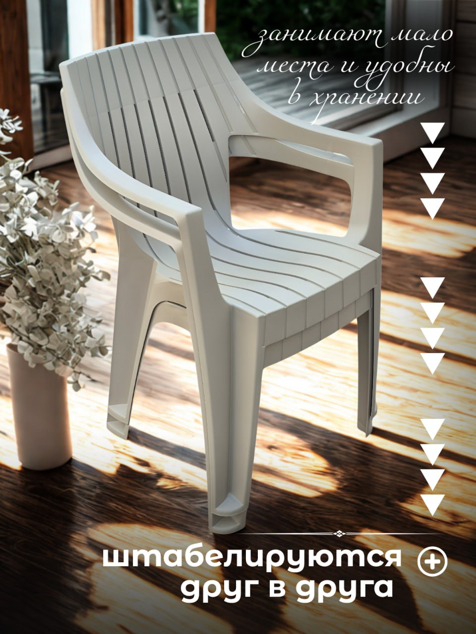 Стулья садовые Mega-Plast - это не только красиво, но и удобно! Наши кресла выполнены из качественных материалов и обеспечивают максимальный комфорт во время отдыха. Они прекрасно подойдут для использования как внутри помещения, так и на открытом воздухе. Наслаждайтесь комфортом и красотой!
