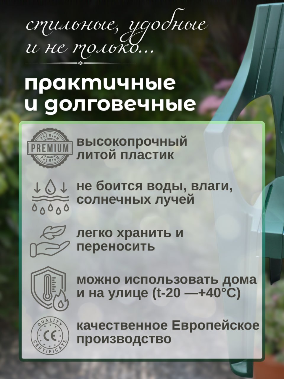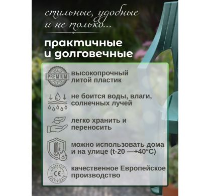 Стулья садовые Mega-Plast - это не только красиво, но и удобно! Наши кресла выполнены из качественных материалов и обеспечивают максимальный комфорт во время отдыха. Они прекрасно подойдут для использования как внутри помещения, так и на открытом воздухе. Наслаждайтесь комфортом и красотой!