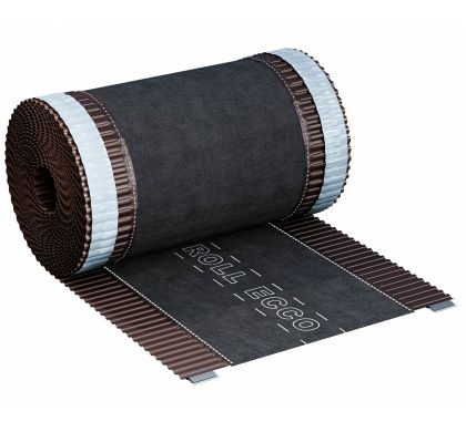 Коньковая лента Eurovent® ROLL ECCO изготовлена из профилированного алюминиевого листа, ПП волокна и бутиловой ленты. Обеспечивает вентиляцию и защиту поверхности крыши от влаги и пыли. Цвета RAL 9005 и RAL 8019.