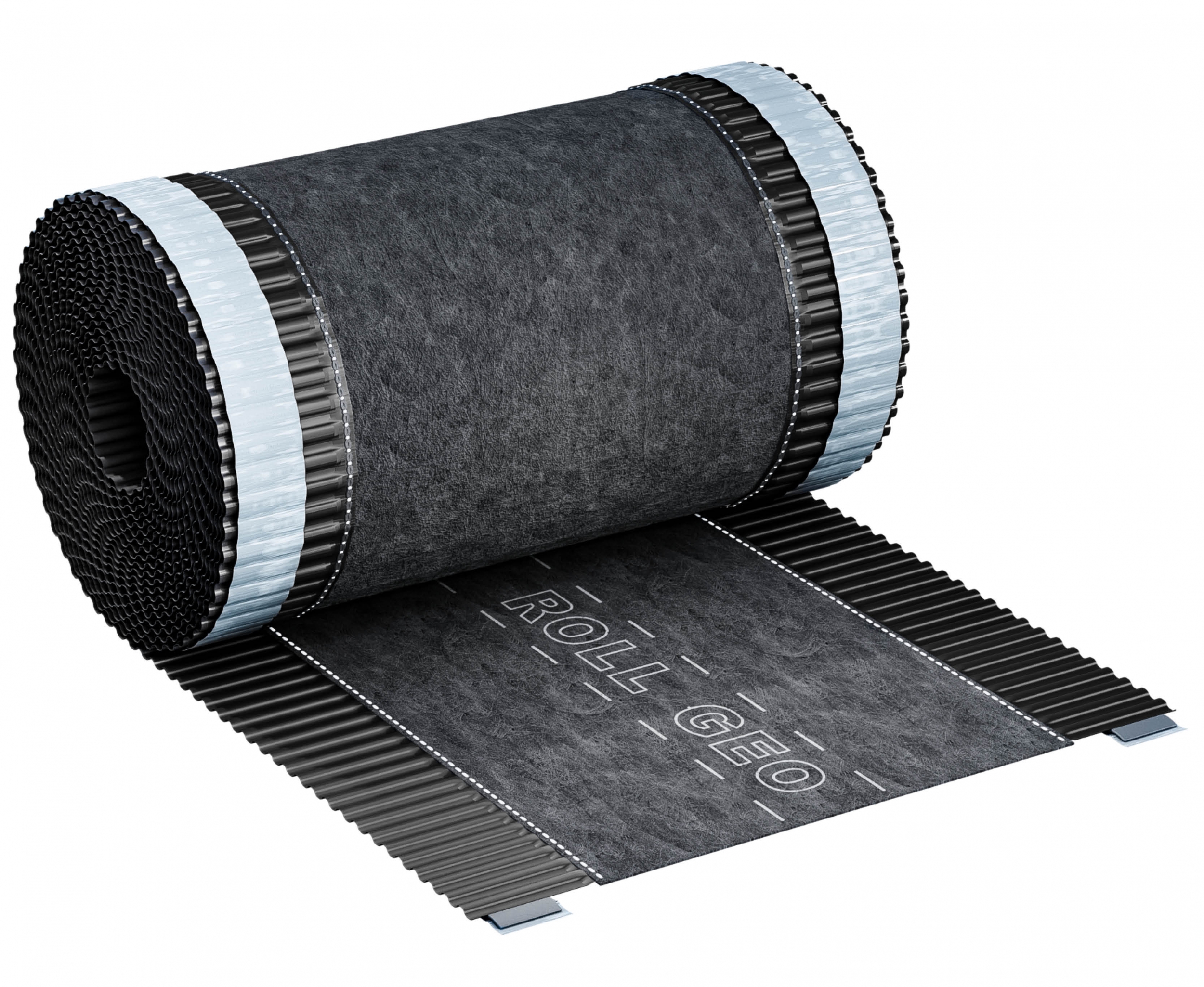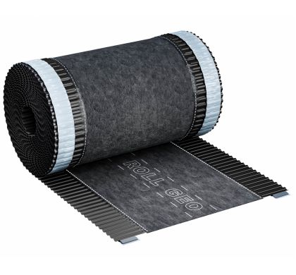 Eurovent® ROLL GEO - oднослойная коньковая лента для горизонтальных и косых коньков. Изготовлена из профилированного алюминиевого листа, геотекстиля и бутиловой ленты. Дополнительным укреплением соединения алюминиевого листа и геоткани является прошивка специальной нитью. Цвета по RAL 9005, 8019.